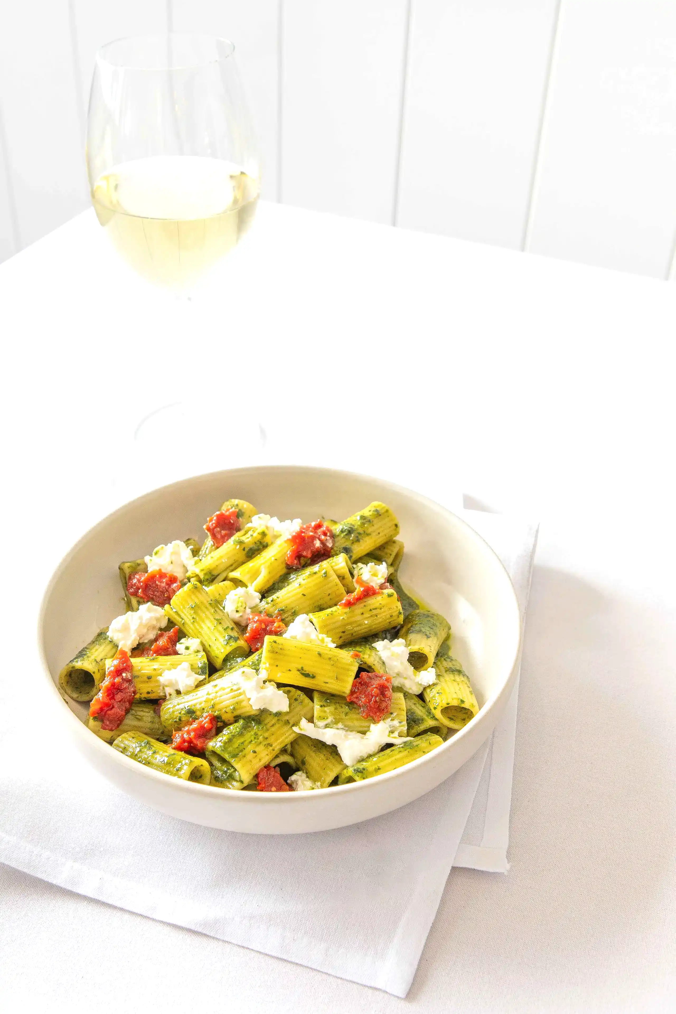 - Rigatoni — Angelo’s House-made Pesto, Semi-dried Tomatoes, Stracciatella
